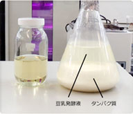 フクユタカのイソフラボンを抽出するために、イソフラボンとなじみやすい触媒を入れ豆乳発酵液を分離・選別。イソフラボンと美肌効果を知り尽くした研究所ならではの独自製法を取り入れています。